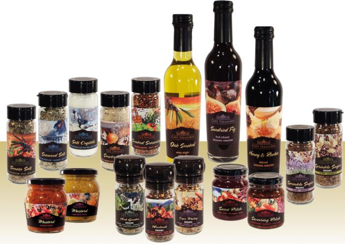 Het assortiment van Cape Treasures omvat de volgende producten:- Balsamico-azijn;